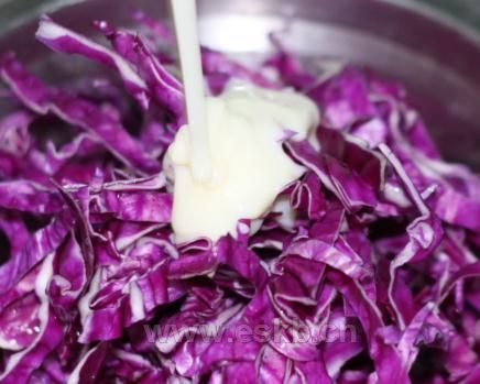 一盘清爽香甜的炼乳拌紫甘蓝就做好了,女儿一个人消灭了一大半,本来孩子就爱吃甜的东西,不过这种凉菜还是不错的,保存了营养既甜又爽口。